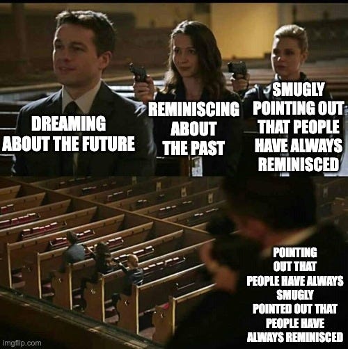 I recently saw someone quip on Substack Notes, “we used to dream about the future; now we dream about the 90s.”4 And while I take the point (and commend its wit), I would contend that we have always dreamed about both the past and the future. Perhaps our nostalgia for yesteryear and our longing for a better tomorrow are really the same thing.